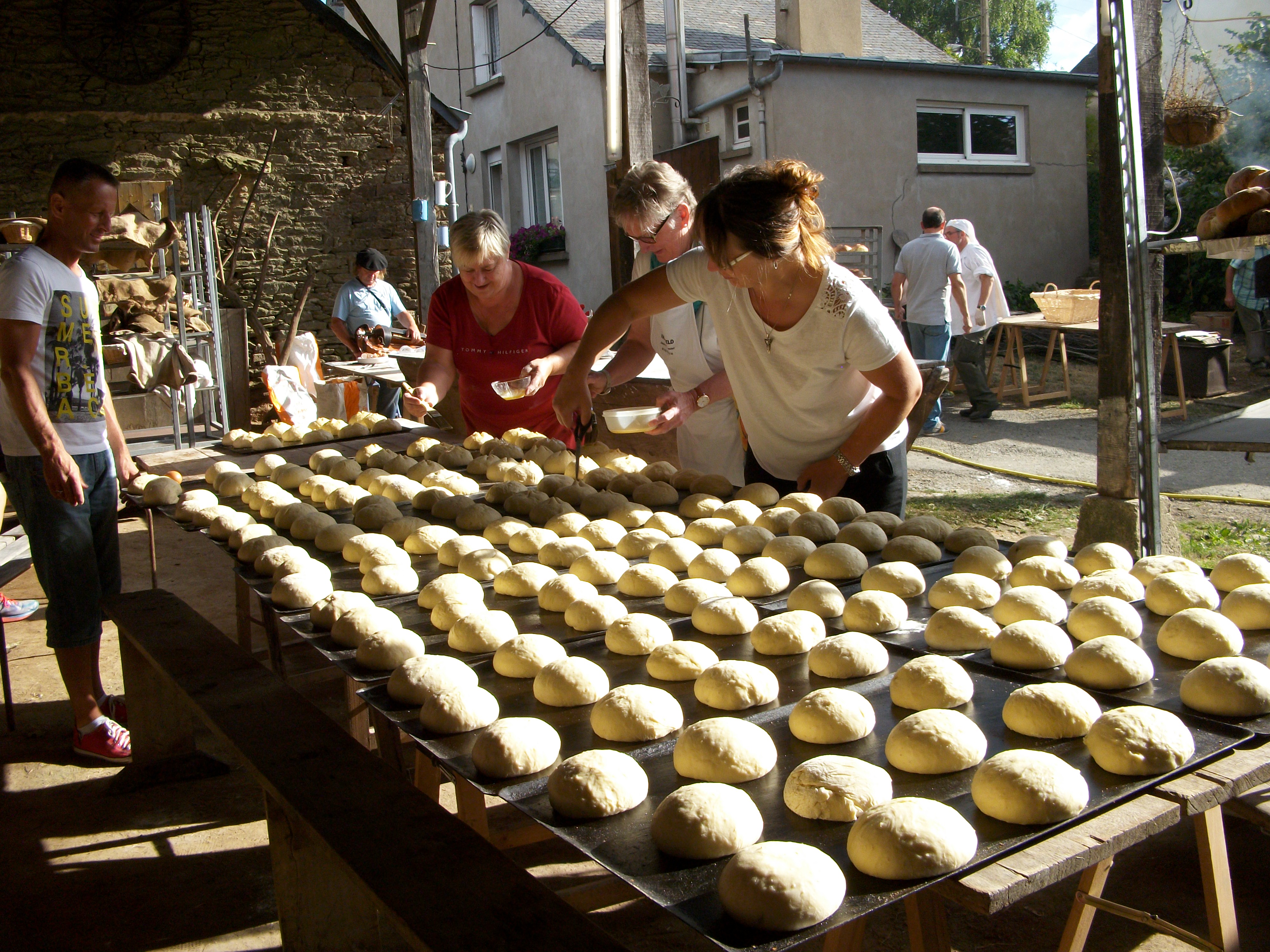 Malgré la barrière de la langue, nous nous comprenons et avons décidé au travers d’échanges annuels de partager cette passion. Chaque année jeunes et moins jeunes de nos deux pays aiment se retrouver pour animer conjointement deux fêtes franco-allemandes du Pain. La première en Bretagne chez nous à Plouguenast-Langast à la fin du mois d’août où quelques 2000 visiteurs apprécient notre travail d’équipe autour du pétrin et du four à pain. La seconde chez nos amis allemands se déroule à Eckarsthausen au printemps, où l’ancien four à pain du village est rallumé. Au programme de ces échanges : soirées galettes bretonnes, musique traditionnelle, chants, repas cuit au four à pain, fournées de spécialités locales (pains de seigle, pâtisseries allemandes, brioches au Chouchen, pains au levain) le tout cuit au four à bois.